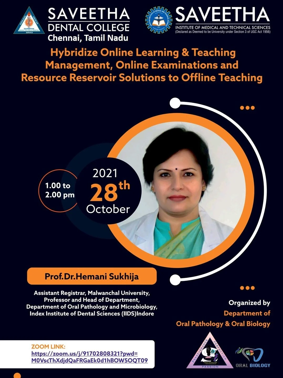 Webinar We organized this webinar on Online-Offline teaching hybridization by Prof. Dr. Hemani Sukhija. WebinarOral Pathology28 October 2021Oral pathology, Oral Pathology Saveetha, Oral Biology Facebook0 Twitter 0 Likes