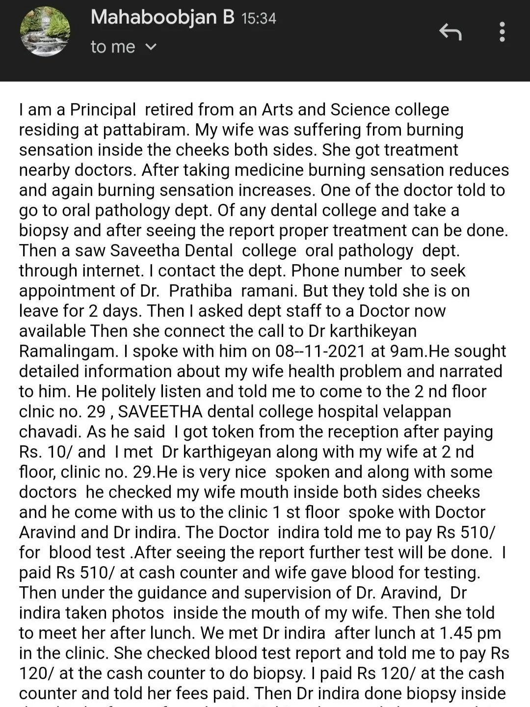 Patient Testimonial for our department along with his appreciation to our professor, Dr. R. Karthikeyan.