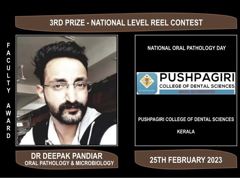 We are proud that our Associate professor, Dr. Deepak Pandiar won the 3rd prize in the national level reel contest of Pushpagiri College of Dental Sciences, Kerala